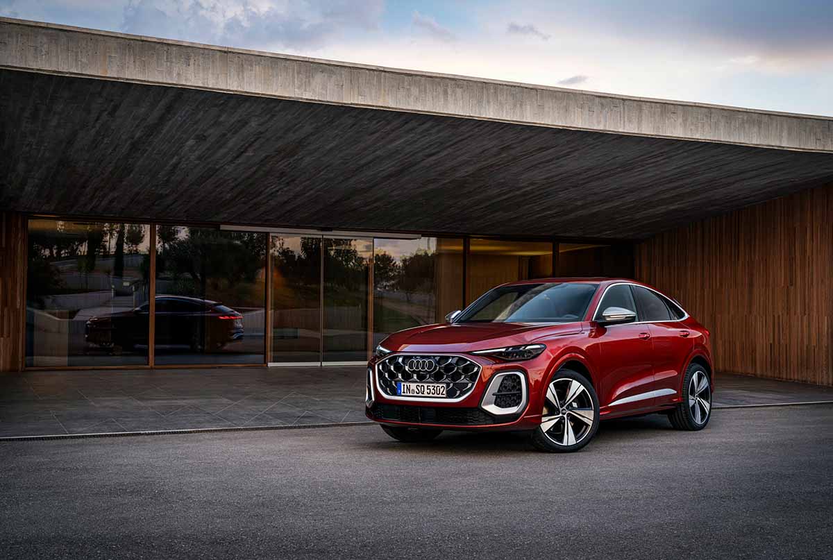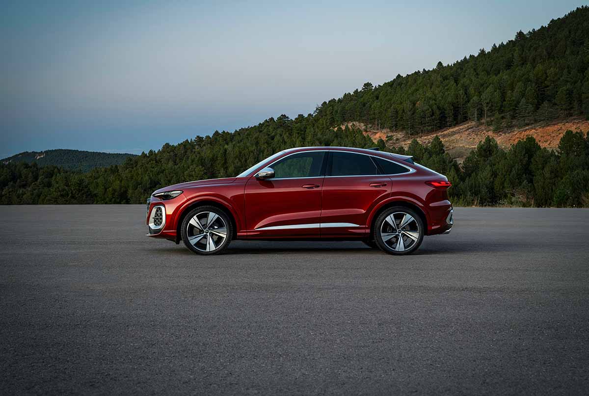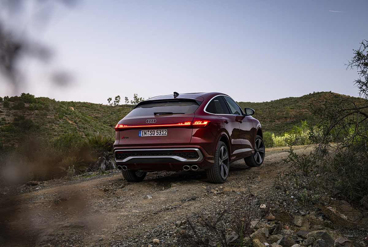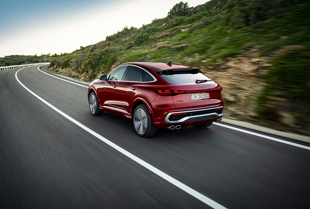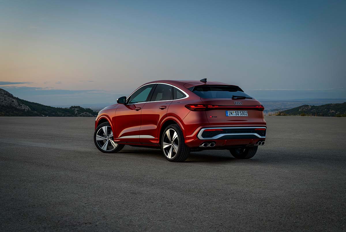 O Audi SQ5 Sportback se destaca pela silhueta coupé e pelos elementos exclusivos da linha S, como acabamentos em alumínio e detalhes que reforçam sua identidade esportiva. A traseira com quatro saídas de escape e a faixa de luz contínua ampliam sua presença marcante, enquanto proporções equilibradas destacam seu perfil dinâmico.